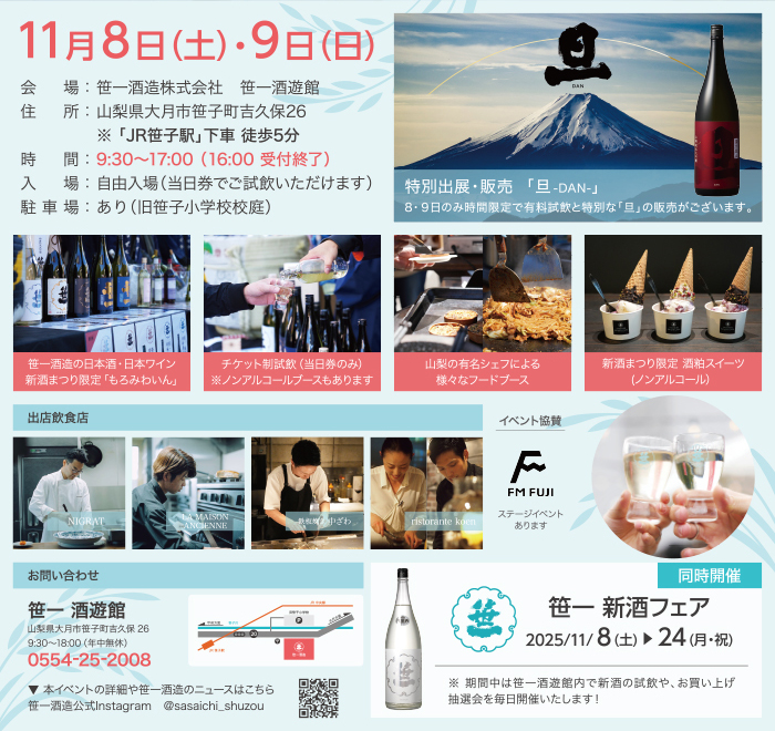 2025年11月8日(土) 、 11月9日(日)の2日間、富士御坂の水と大地の恵を存分に活かし醸造した、できたての日本酒と日本ワインを味わえる世界で唯一の解禁イベント、「笹一 新酒まつり2025」を開催致します!